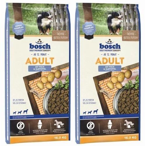 Bosch Adult Fisch & Kartoffel 2 x 15 kg ADULT FISCH & KARTOFFEL ist eine ausgewogene Vollnahrung für alle ausgewachsenen Hunde mit normaler Aktivität. ADULT FISCH & KARTOFFEL enthält neben Geflügelfleisch als wichtigen Eiweißlieferanten hochwertigen Fisch. ADULT FISCH & KARTOFFEL …