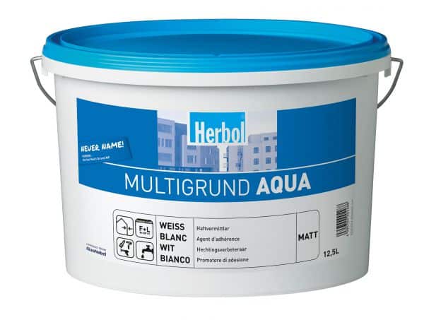 Herbol Multigrund Aqua – Weißpigmentierter Haftvermittler für außen und innen “ Herbol Multigrund Aqua Herbol Multigrund Aqua ist eine wasserverdünnbare Grundierfarbe für feste, glatte, schwach oder nicht saugfähige Untergründe, fest haftende Altbeschichtungen, Gipskarton, Gipsputz, glatter Beton und Kalksandstein. Eigenschaften: Ausgezeichnete Haftung auf komplexen Untergründen Egalisiert die Saugfähigkeit des Untergrundes Bietet ideale Haftung für folgende Beschichtungen Anwendungsbereich: Außen Technische Daten: Verbrauch: ca. 120-180ml/m² je nach Beschaffenheit und Saugfähigkeit des Untergrundes Farbton: Weiß Glanzgrad: Matt Verarbeitung: Streichen, Rollen, Spritzen (airless) Trockenzeit: Überarbeitbar nach ca. 5-6 Stunden. Geeignete Untergründe Gipskarton Gipsputz Glatter Beton Kalksandstein Untergrundbedingungen Der Untergrund muss fest, sauber, tragfähig, trocken und frei von Ausblühungen, Algen, Moos, Pilzbefall, Mehlkornschichten, Sinterschichten und Trennmitteln sein. Weitere technische Details und Hinweise zur Verarbeitung können Sie dem Produktdatenblatt entnehmen. „