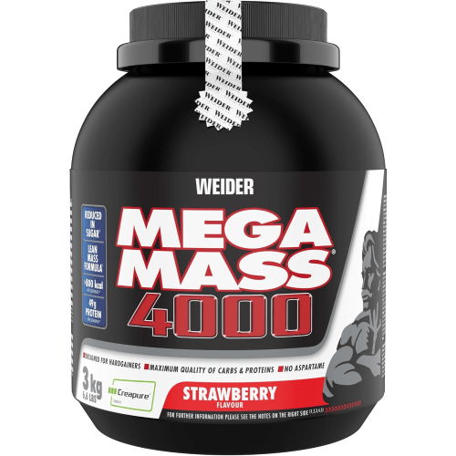 Weider – Mega Mass 4000 Das Pulver in den verschiedensten Geschmacksrichtungen liefert reichlich Nährstoffe für den Muskel- und Masseaufbau. Mega Mass 4000 – Vorteile auf einen Blick für effektiven Aufbau von Kraft und Masse mit Kreatin und hochwertiger Stärke Mix aus Kohlenhydraten und Protein Zusatz von Vitaminen und Mineralien mit CREAPURE 1 Portion hat bis zu 845 kcal (49g Eiweiß und 128g Kohlenhydrate und nur 14 g Fett) enthält BCAAs, Glutamin und Arginin in leckeren Geschmacksrichtungen verfügbar Mega Mass 4000 – was ist das, und was bringt mir das? Mega Mass 4000 ist eine Kohlenhydrat-Proteinmischung mit zugesetzten Mikronährstoffen und Kreatin.Damit liefert Mega Mass 4000 neben der Kombination aus Kreatin und hochmolekularer Stärke eine Drei-Komponenteneiweißmischung aus Milch (Isolat), Molke (Isolat) und Eiklarprotein. Diese enthält alle wichtigen Aminosäuren, darunter BCAA’s, Glutamin und Arginin, und unterstützt den Aufbau von Muskelmasse. Die Rezeptur ist 100% aspartamfrei! Mega Mass 4000 von Weider – für wen geeignet? Mega Mass richtet sich in erster Linie an Athleten, Kraftsportler und Bodybuilder, die das Ziel haben Masse aufzubauen. Für die Masseaufbauphase liefert dieses Produkt einen effektiven Nährstoff-Mix, um schnelle Erfolge zu erzielen, und ist damit besonders für Hardgainer interessant. Auch für Deine nächste Kraftaufbauphase ist dieses Produkt ideal. Seit vielen Jahren gehört Weider Mega Mass 4000 zu den erfolgreichsten und beliebtesten Weight Gainern weltweit! Wie wird Mega Mass 4000 verwendet? Mische für ein Portion 150g Pulver in 550ml fettarme Milch oder Wasser.Du kannst täglich eine Portion Weider Mega Mass 4000 je nach Protein- und Kreatinbedarf nutzen, vorzugsweise an Trainingstagen nach dem Training oder an Nicht-Trainingstagen nach dem Aufstehen.