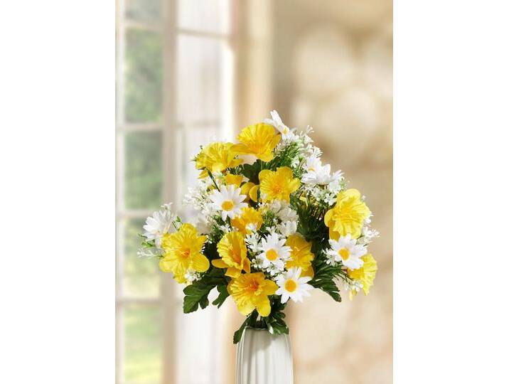 Verleihe deinem Zuhause mit dem Osterglocken-Margeriten-Zweig im 3er-Set einen frühlingshaften Akzent. Diese kunstvoll gestalteten Zweige in Gelb-Grün bringen die Farben des Frühlings direkt in deine Vase und sorgen für eine lebendige Atmosphäre. Die feinen textilen Blüten sind so realistisch, dass sie kaum von echten Blumen zu unterscheiden sind, und bieten eine langanhaltende Schönheit ohne Pflegeaufwand.Jeder Zweig hat eine Höhe von ca. 55 cm, was sie ideal für verschiedene Vasenformen und -größen macht. Ob als Teil deiner Frühlingsdekoration oder als stilvolles Element in deinem Wohnraum, die Osterglocken-Margeriten verleihen jedem Raum eine frische Note. Das Kunstmaterial sorgt dafür, dass die Farben strahlend bleiben und die Blüten auch nach längerer Zeit ihre Anziehungskraft nicht verlieren.Nutze die Vielseitigkeit dieser Zweige, um dein Zuhause individuell zu gestalten. Ob im Wohnzimmer, Essbereich oder Flur, das 3er-Set lässt sich wunderbar kombinieren und sorgt für ein harmonisches Gesamtbild. Setze auf die zeitlose Eleganz der Osterglocken-Margeriten und genieße die Frühlingsstimmung das ganze Jahr über.