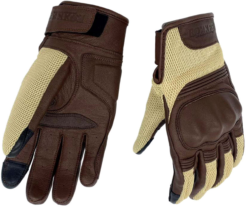 Sommerliche Motorradhandschuhe aus Leder/Air-Mesh-Mix mit ergonomischer Passform. Eigenschaften Zertifiziert nach EN 13594:2015 Air-Mesh-Details auf der Oberhand für optimale Venti Ergonomisch geformtes Design Handrücken mit rautenförmig gesteppten Details Aufwendige Materialverstärkungen an Handfläche, Daumen und kleinem Finger Verstellbares Handgelenk mit Gummizug und Klettverschluss Knöchel-Protektoren Touchscreen-kompatibel ROKKER-Prägung auf der Handfläche