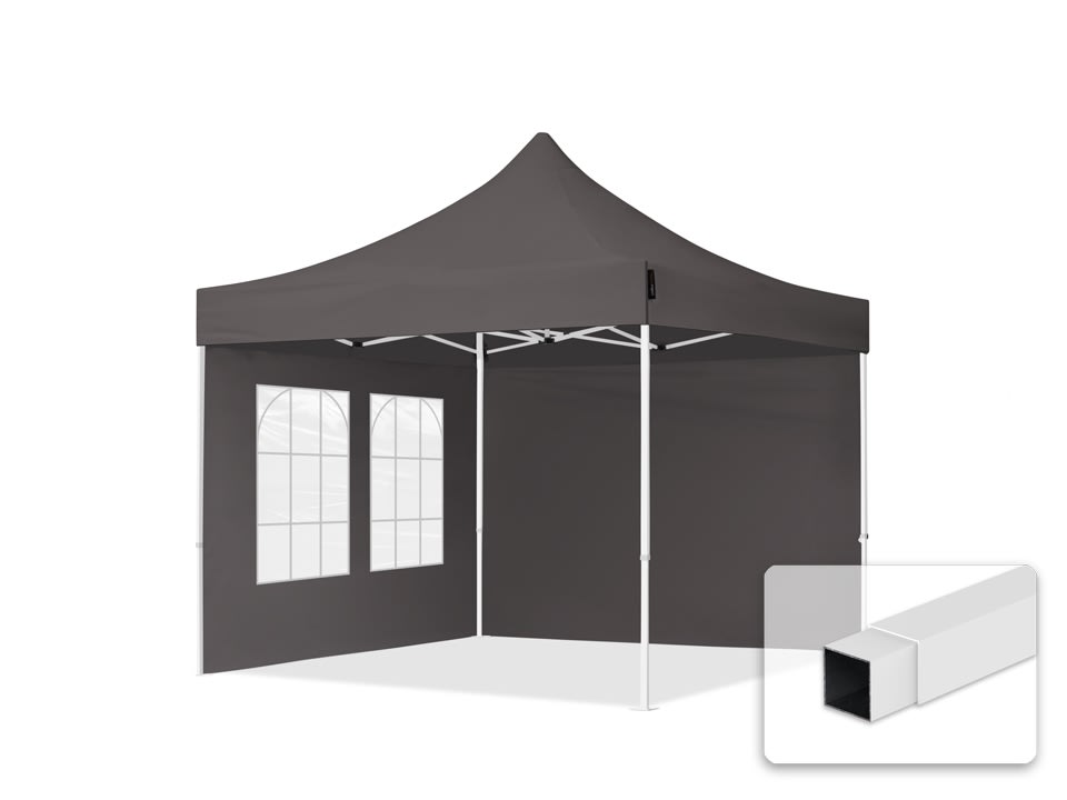 3x3m Stahl Faltpavillon, inkl. 2 Seitenteile, dunkelgrau: Wer eine solide Stabilität für den temporären Einsatz sucht, wird beim 3x3m großen TOOLPORT Faltpavillon fündig. Mit einer Grundfläche von 9m² eignet sich dieses faltbare Zelt hervorragend für Veranstaltungen und Partys jeder Art – von Hochzeiten bis hin zu Messeevents. Das Gestänge ist aus hochwertigem Stahl gefertigt und dank professioneller Pulverbeschichtung stabil, sowie verwindungssteif. Die Standbeine verfügen über ein robustes Vierkantprofil mit einem Durchmesser von ca. 30 mm und einer Wandstärke von ca. 1 mm. Das Gestänge aus Stahl ist außerdem 3-fach höhenverstellbar. Als Plane kommt hochwertiges Hochleistungs-Polyester zum Einsatz. Das Hochleistungs-Polyester ist mit PVC beschichtet und somit sehr reißfest, strapazierfähig und wetterfest zugleich. Speziell besitzt die Plane des TOOLPORT Faltpavillons eine Reißkraft von 700 bzw. 300 g/m² pro 5cm Planenbreite und ist in der Farbe dunkelgrau bekleidet. Entscheiden Sie individuell nach Ihrem Gusto, ob Sie ein Modell mit oder ohne Seitenteile, sowie ob mit oder ohne Fenstern, favorisieren. Ein Faltpavillon mit Seitenteilen bietet Schutz vor seitlich fallendem Niederschlag, Wind, unerwünschten Blicken und Schatten. Ein Modell ohne Seitenteile hingegen ist von allen Seiten erreichbar und dadurch insbesondere auf Messen beliebt. Seitenteile ohne Fenster begünstigen zudem Privatsphäre, während Fenster Tageslicht in den Pavillon lassen. Dank des praktischen Scherenmechanismus mit integriertem Klicksystem lässt sich der Faltpavillon im Handumdrehen ohne Werkzeug aufstellen und abbauen. Zur Erhöhung der Standfestigkeit und Stabilität kommen ca. 60×60 mm große Fußplatten aus Stahl, sowie Abspannseile, zum Einsatz. Im zusammengepackten Zustand nimmt der Faltpavillon außerdem nur wenig Platz in Anspruch – perfekt für mobile Einsätze! Apropos Mobilität: Neben Bodenbefestigungen beinhaltet der Lieferumfang eine praktische Transporttasche. Diese besteht aus hochwertigem Oxford-Material, weist Rollen auf und ist somit ideal für den schnellen Transport geeignet.